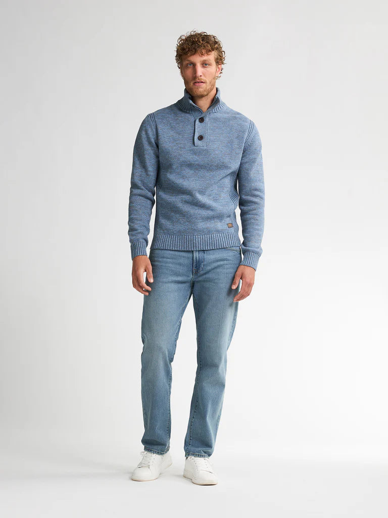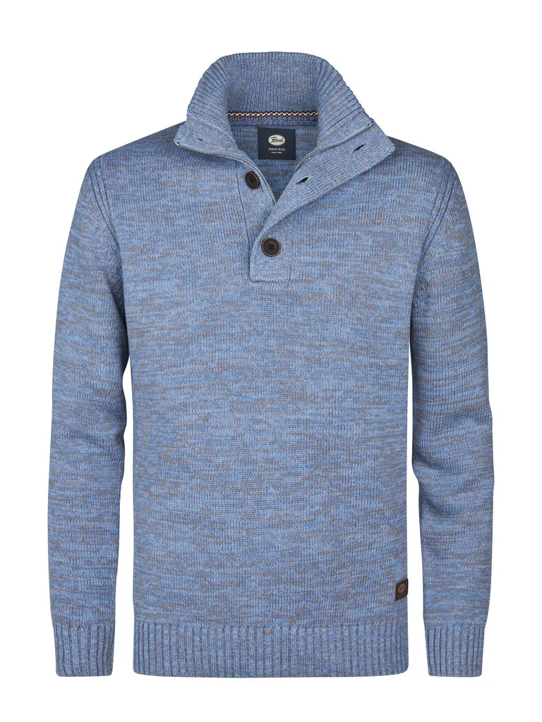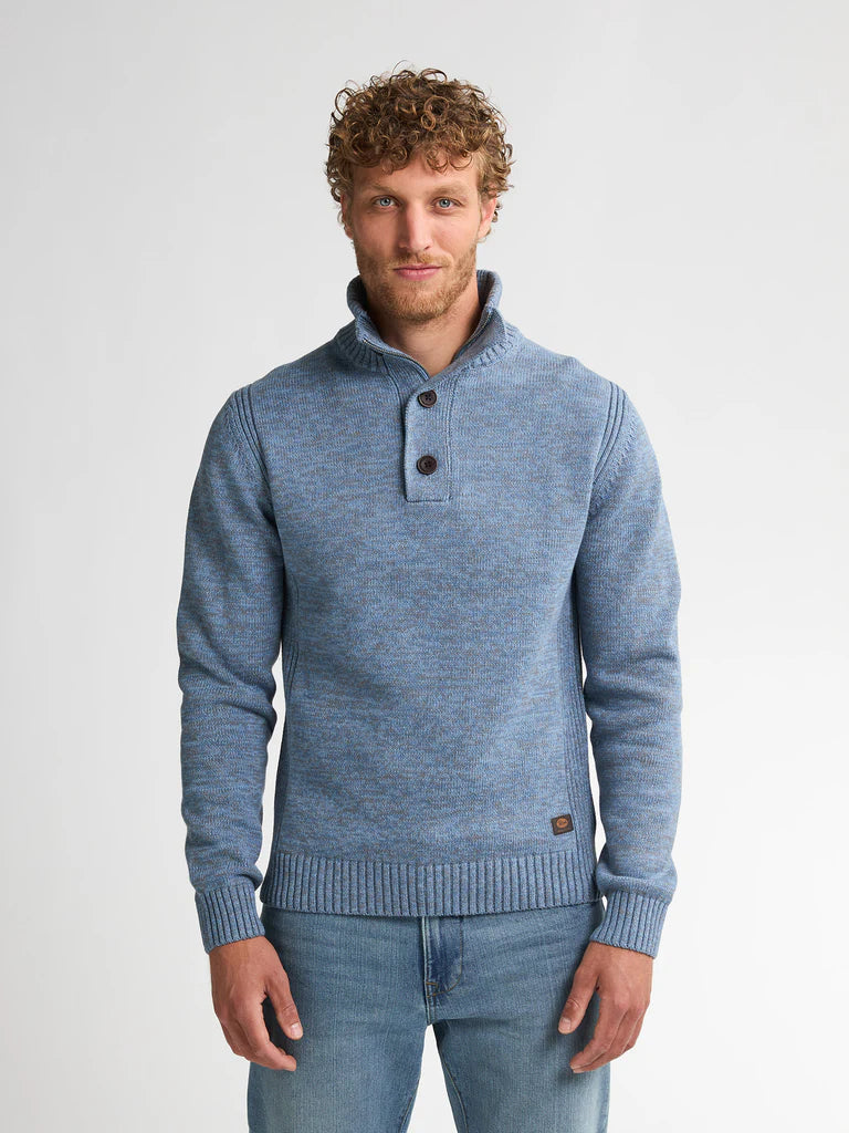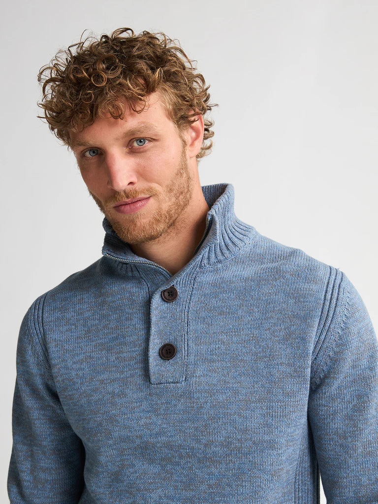 This knitted sweater with a stand-up collar and buttons is the perfect choice for a stylish and comfortable look. Made from a premium blend of 66% cotton, 21% recycled cotton, and 13% recycled polyester, this sweater offers both an eco-friendly and breathable experience. The stand-up collar and buttons provide an extra rugged and functional look, while the zipper adds versatility. The regular fit offers a comfortable fit that is perfect for everyday wear. Pair this sweater with jeans or chinos for a versatile, casual outfit.